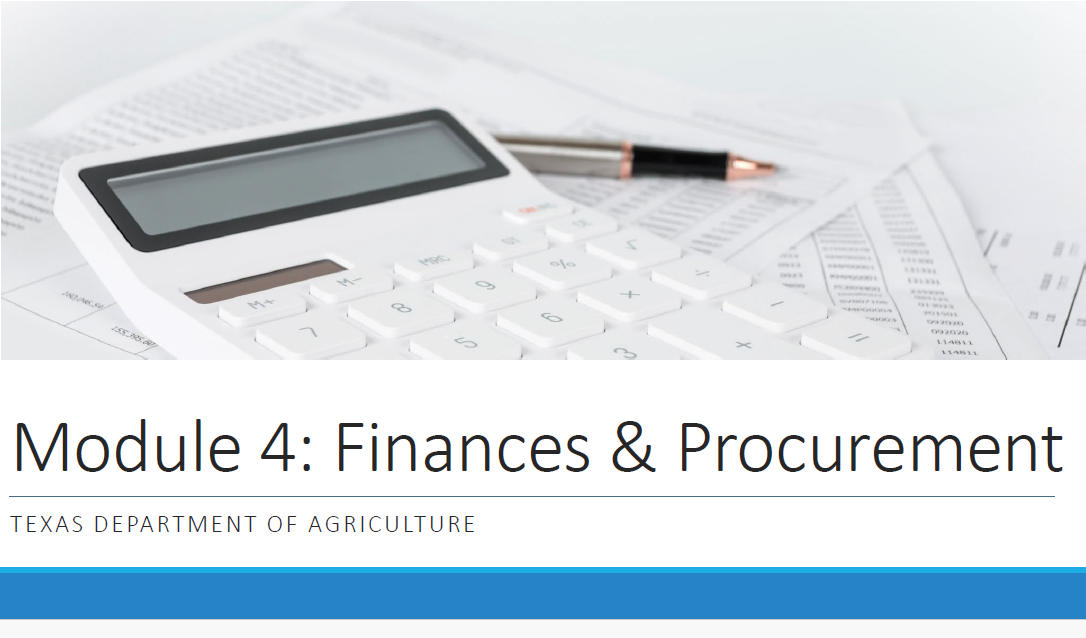 In this module, you will review direct and indirect costs, indirect cost rates, and identifying which expenses are allowable vs. the ones that aren't. This module will also review how administrative funding is allocated to the CSFP and procurement requirements. |