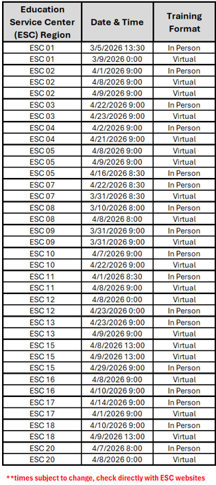 In-Person SFSP Training hosted by each Education Service Center on the dates below. Find your ESC Region.