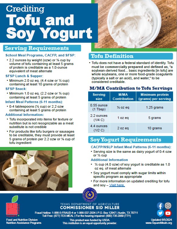 Revised Tofu and Soy Yogurt Crediting Handout - Use this handout to review a summary of the revised tofu and soy yogurt crediting in the School Meal Programs, CACFP, and SFSP. |