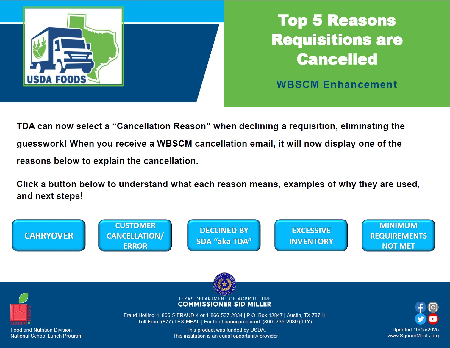 NSLP FAL - Each program year, the USDA Foods team builds the catalogs in WBSCM off RA Feedback from USDA Foods Feedback Survey as well as analyzing historical data for materials that were offered in previous program years by RAs. All USDA Foods available will be offered for Further Processing. Click below for Direct Delivery available foods. SY25-26 SY26 NSLP Round 2 FAL