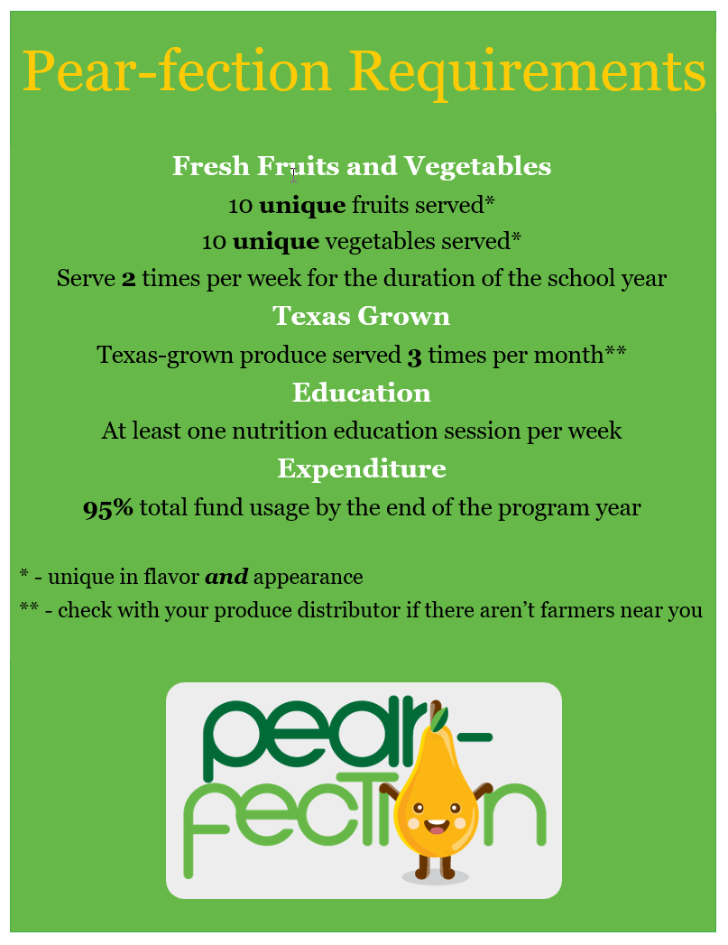 The Pear-fection Award recognizes schools that take extra steps to ensure the Fresh Fruit and Vegetable Program has a lasting impact for students. These schools meet the award’s criteria for frequency, quantity, and variety in the serving of fruits and vegetables purchased with the program’s grant funds. They also expend most of the funds awarded and include Texas grown products and nutrition education in their programs. Pear-fection award recipients have demonstrated a commitment to promoting fruit and vegetable consumption and healthy lifestyles.