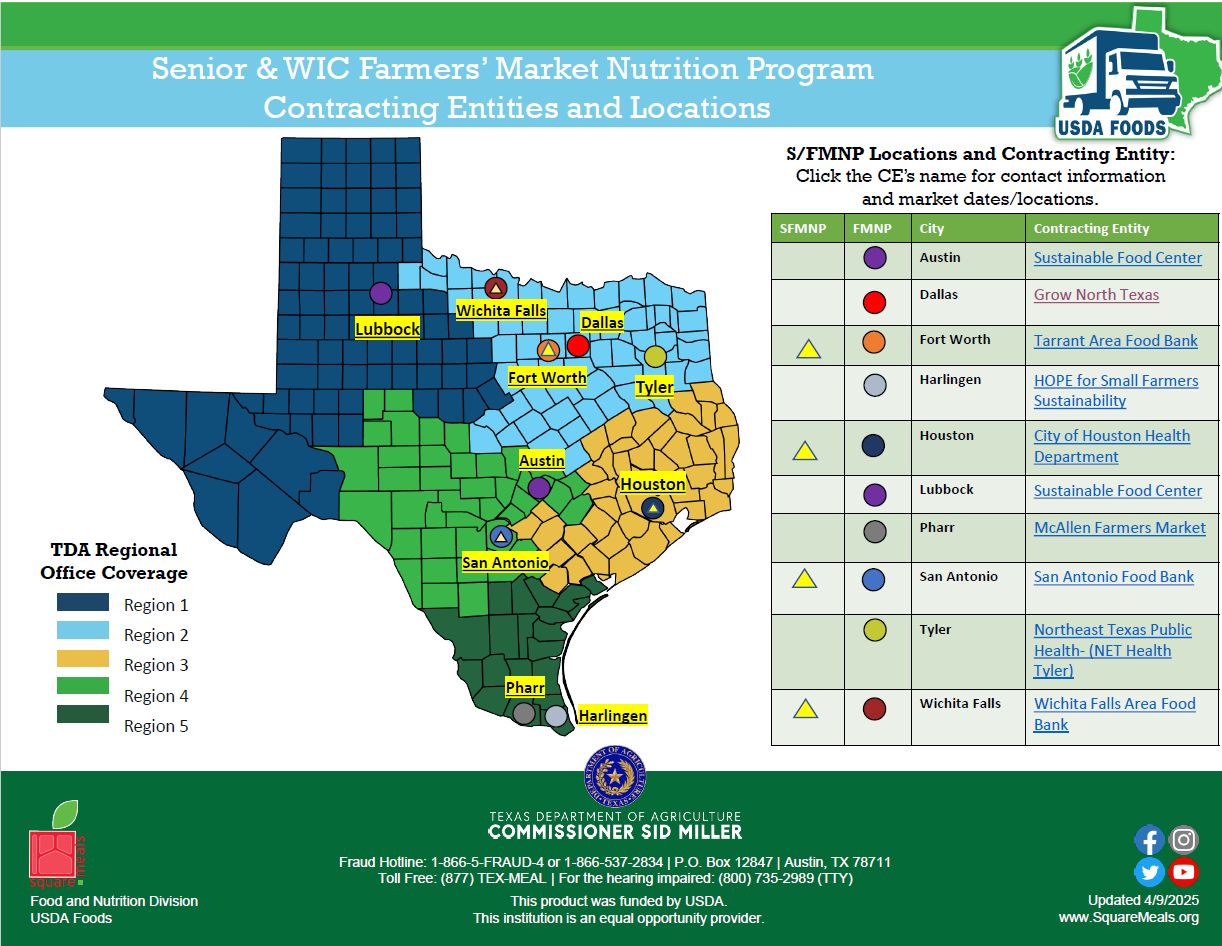 The Senior Farmers Market Nutrition Program (SFMNP) allows low-income eligible senior participants, 60 years of age and older, to purchase locally grown fresh fruits and vegetables using SFMNP vouchers from participating farmers’ market associations and farmers. The SFMNP is only available in the Wichita Falls, San Antonio, and Houston service areas.