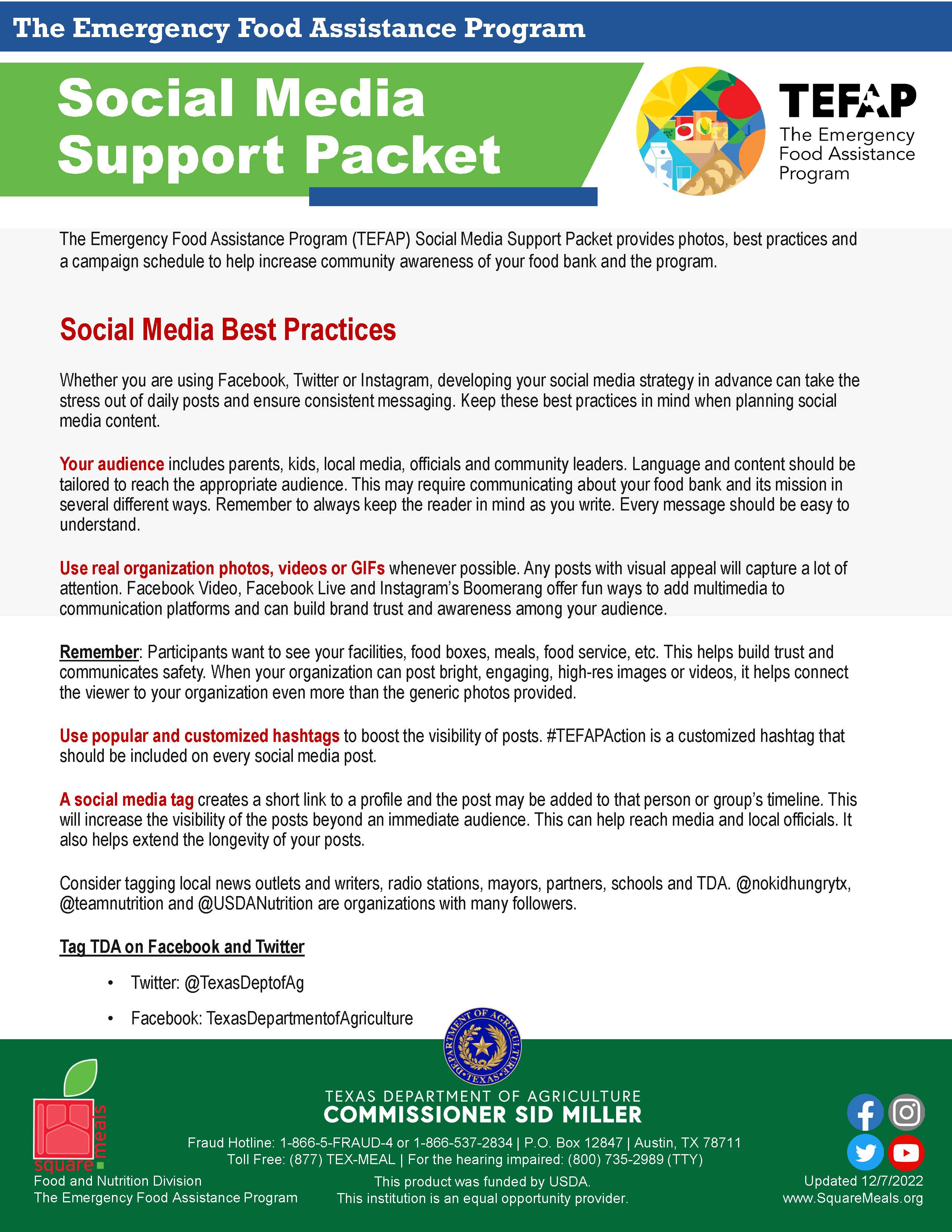 Social Media Support Package: The Emergency Food Assistance Program (TEFAP) Social Media Support Packet provides photos, post copy, best practices and a campaign schedule to help increase community awareness of your food bank and the program.