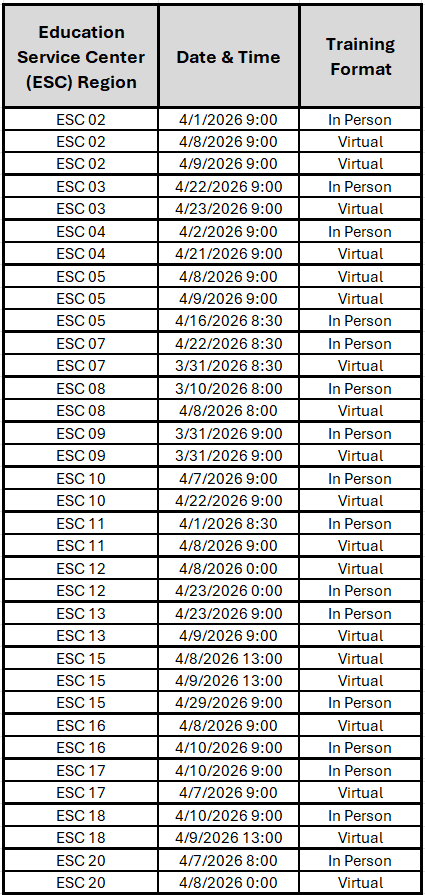 In-Person SFSP Training hosted by each Education Service Center on the dates below. Find your ESC Region.