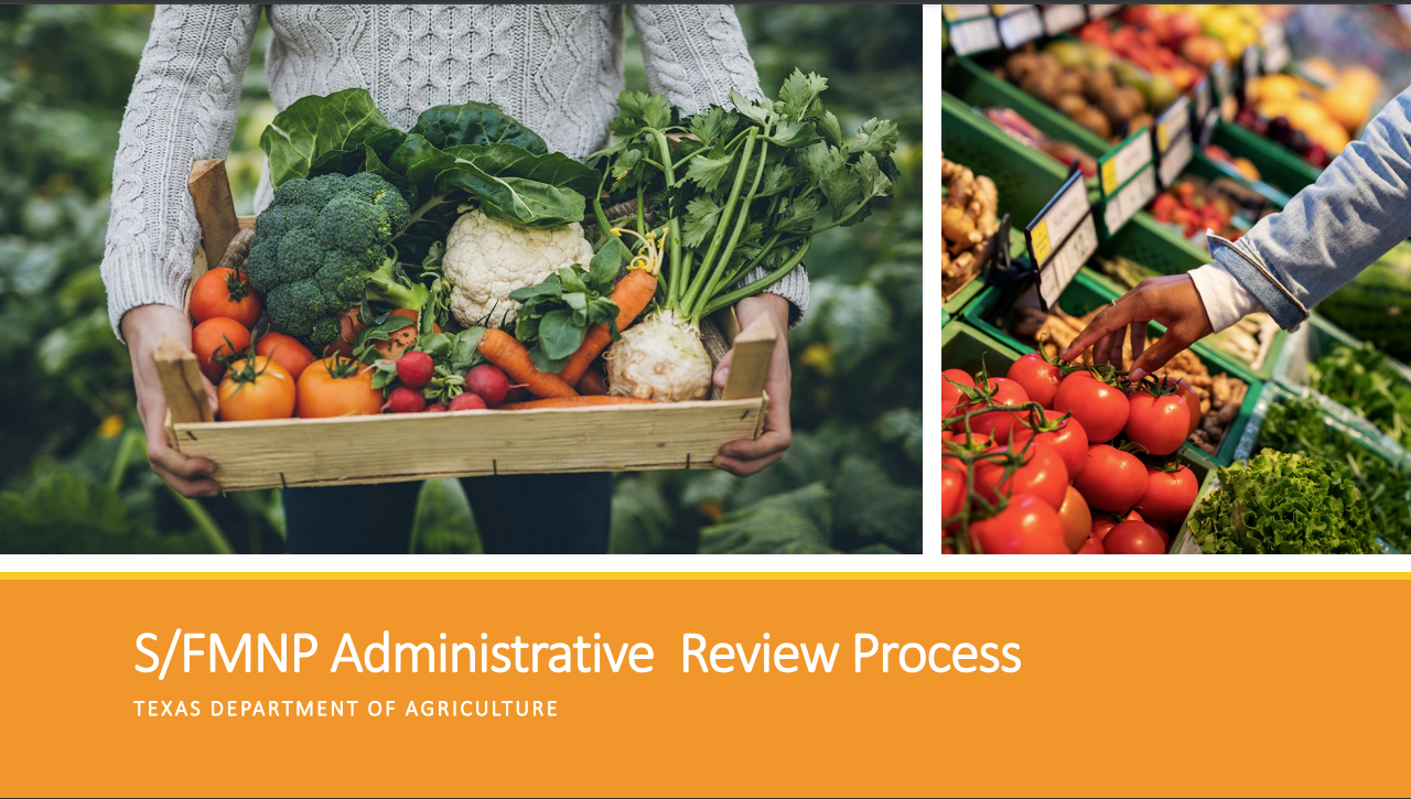TDA is required to conduct interactive training (face-to-face or online) for CEs, FMAs and farmers new to the S/FMNP. Training topics include identification of eligible foods; proper voucher redemption procedures, including deadlines for submission of vouchers; equal treatment of participants; voucher security, storage, and distribution; voucher cancellation procedures; civil rights compliance and guidelines; and retention requirements. |