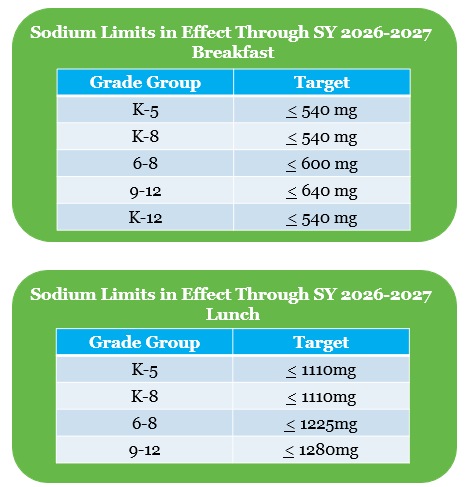- Sodium: The weekly sodium limit for school lunch and breakfast will remain at the current level, known as Target 1, for school year 2022-2023. Through school year 2026-27 (until June 30, 2027), schools will maintain current sodium limits (Sodium Target 1A for lunch and Sodium Target 1 for breakfast).