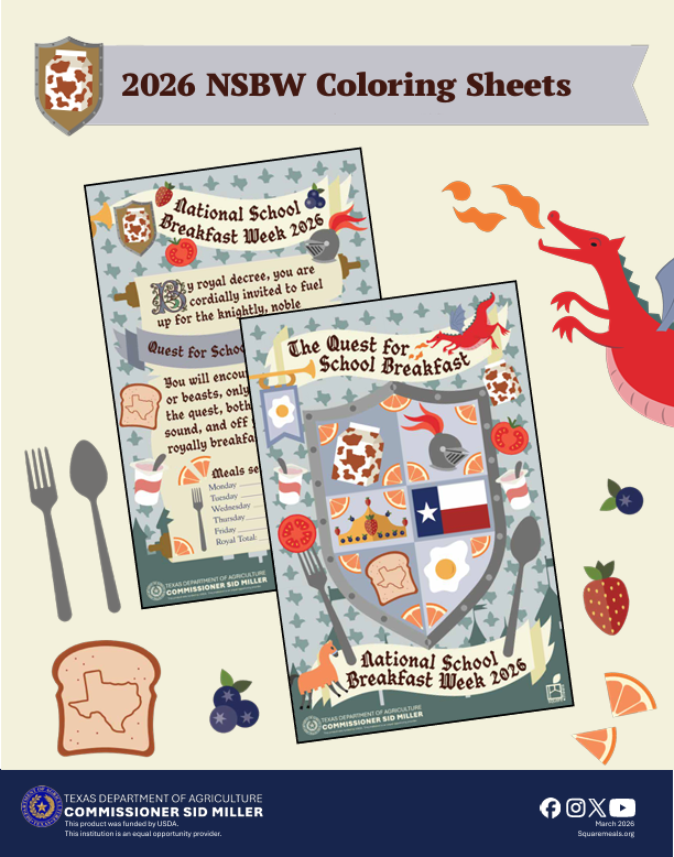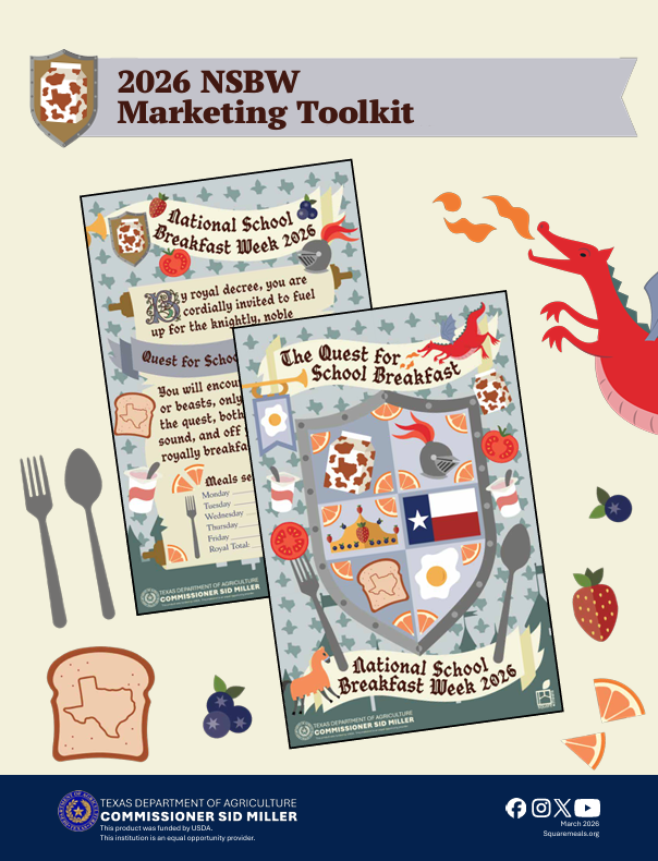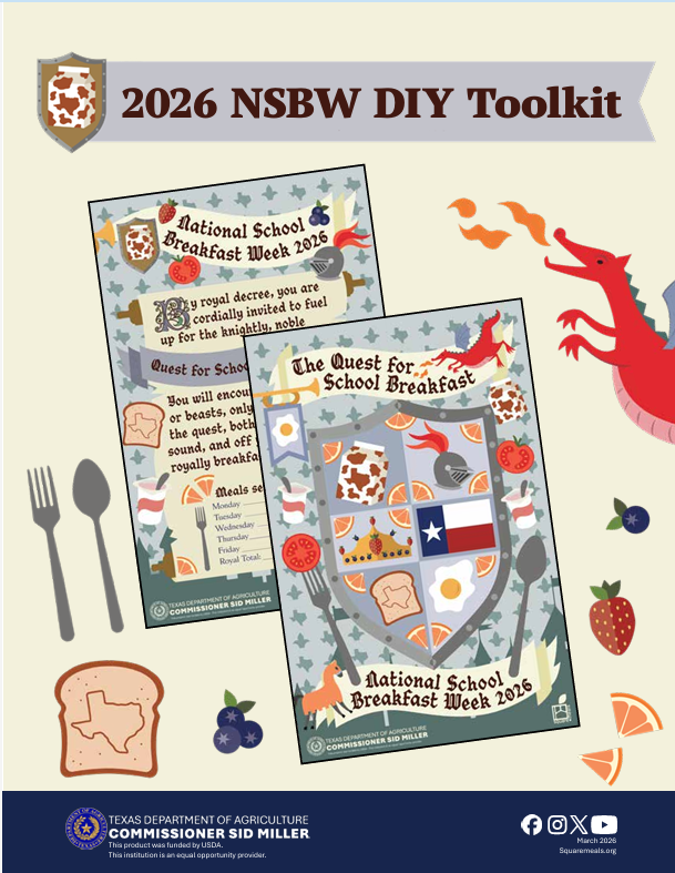 • The Texas Department of Agriculture (TDA) has created materials that enable you and your staff to easily promote participation in National School Breakfast Week (NSBW)! We encourage you to participate in this year’s celebrations to boost student participation and help them crack the code to academic success with a nutritious school breakfast!