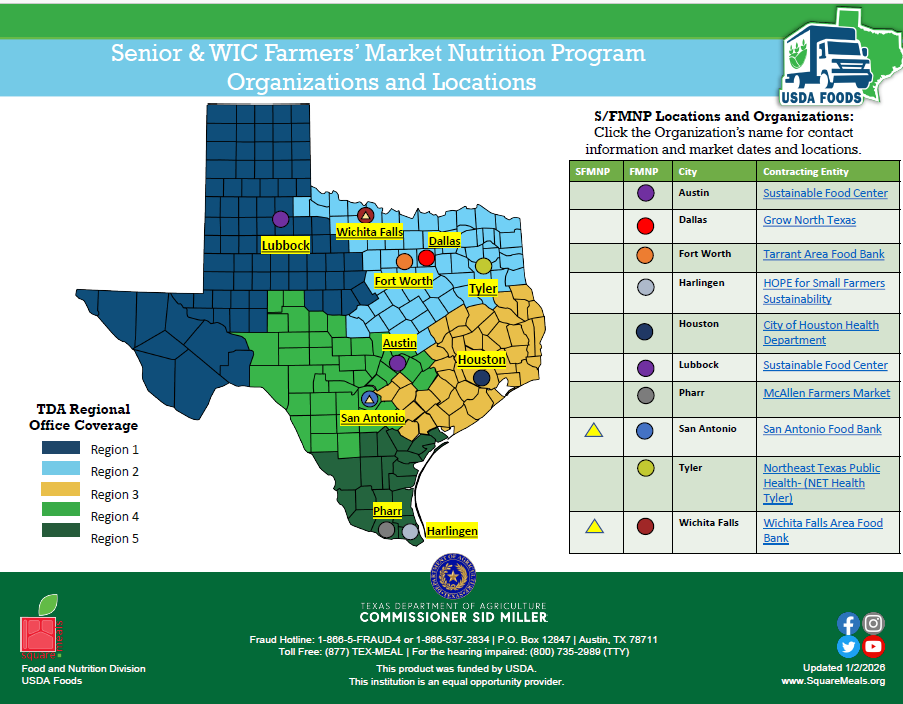 The Senior Farmers Market Nutrition Program (SFMNP) allows low-income eligible senior participants, 60 years of age and older, to purchase locally grown fresh fruits and vegetables using SFMNP vouchers from participating farmers’ market associations and farmers. The SFMNP is only available in the Wichita Falls, and San Antonio service areas.