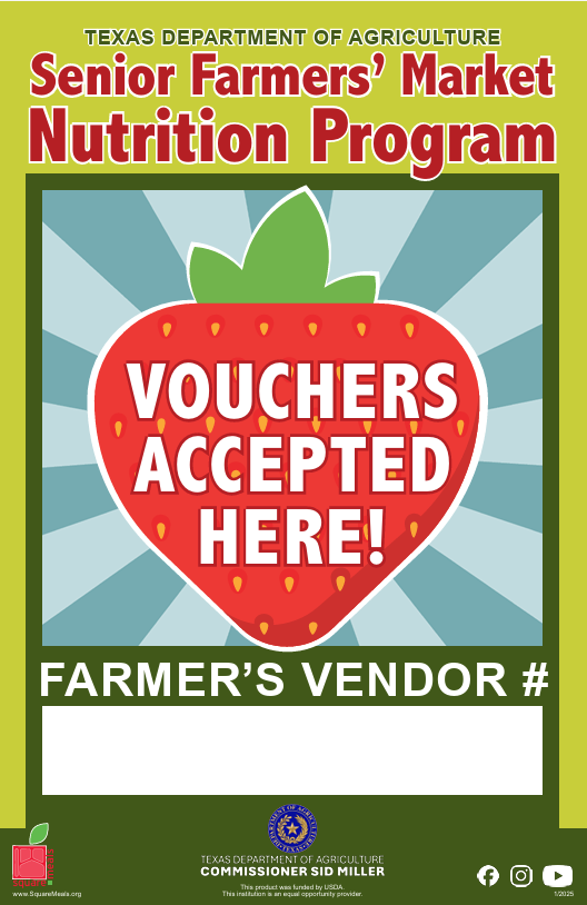 Vendor Posters - Post these at participating market booths to clearly identify vendors who accept Senior Farmers’ Market Nutrition Program (SFMNP) vouchers. Available in English and Spanish.